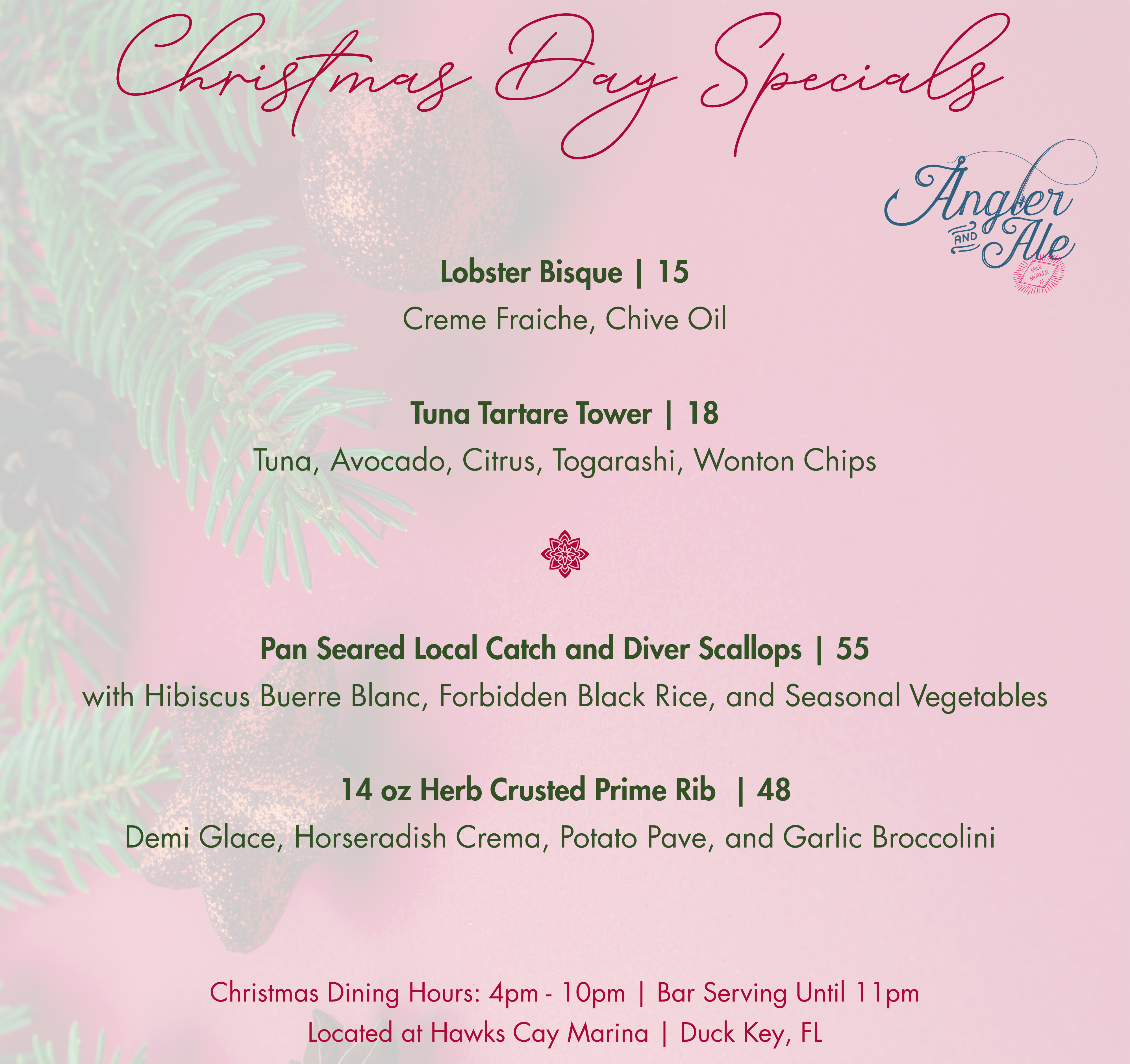 Join us at Angler & Ale this Christmas Day for a seafood-focused holiday dining experience set against the breathtaking backdrop of the Florida Keys. Winter in the Keys brings crystal-clear water, refreshing coastal breezes, and sunshine that feels indulgent rather than intense — ideal for those escaping colder climates. The air is cool and clean, the atmosphere is relaxed, and our waterfront setting offers a front-row seat to the season’s natural beauty. Pair it all with fresh coastal flavors and festive favorites for a Christmas celebration that’s effortless, elevated, and unforgettable. Reservations available starting at 4pm.